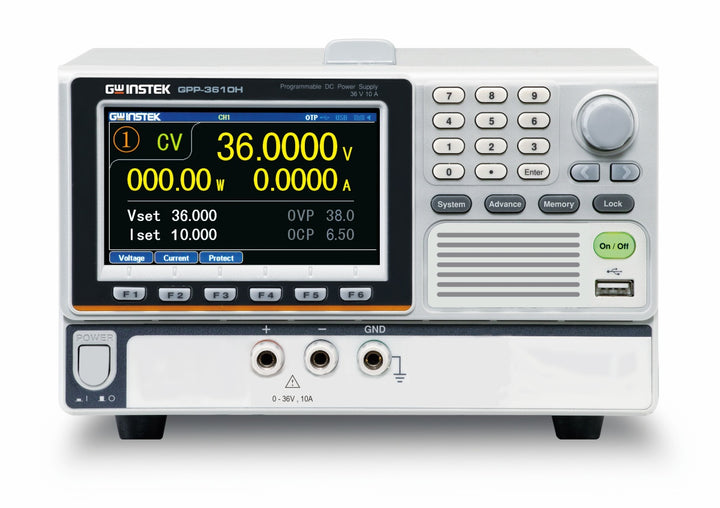 GPP programmable DC power supply series incorporates two new 360W models, namely the 36 V/10 A GPP-3610H and the 72 V/5 A GPP-7250. GPP-3610H provides high programming resolution (1 mV/0.2 mA) and readback resolution (0.1 mV/0.2 mA); GPP-7250 provides high programming resolution (2mV/0.2mA) and readback resolution (0.1 mV/0.1 mA), and the best low ripple noise characteristics ≦1 mVrms ( 5 Hz to 1 MHz) / ≦2 mArms and output transient recovery capability≦100 us.